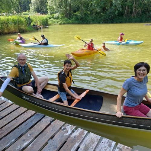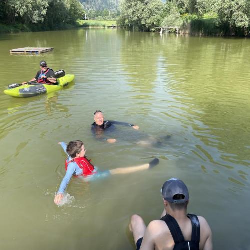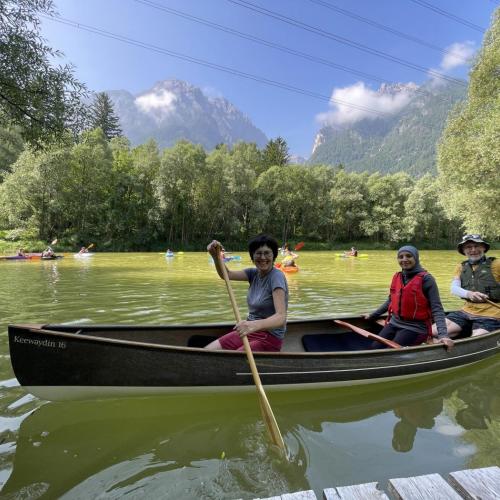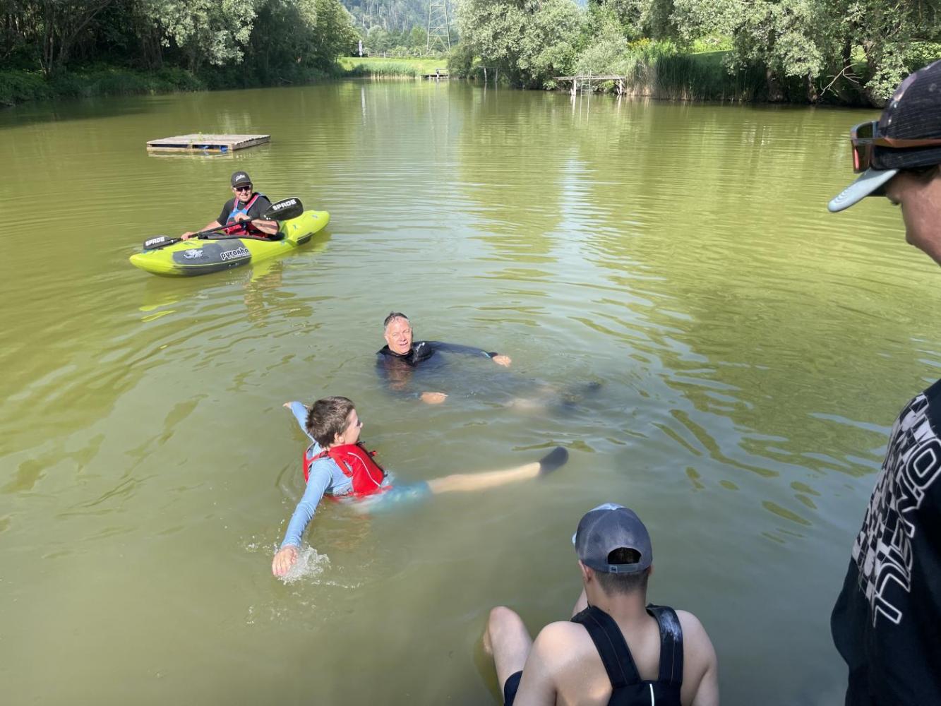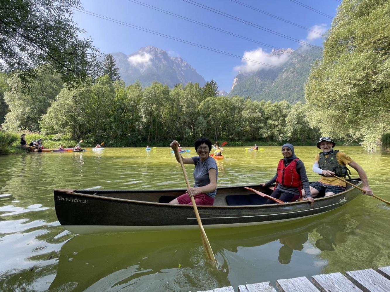 Aber auch jene, die lieber trockene Füße behielten und sich heuer noch nicht ins Kajak trauten, kamen voll auf ihre Kosten. Dank unserer lieben Elfriede und ihrem Hansjörg konnten sie gemütlich eine Runde mit dem Kanu über den See drehen.