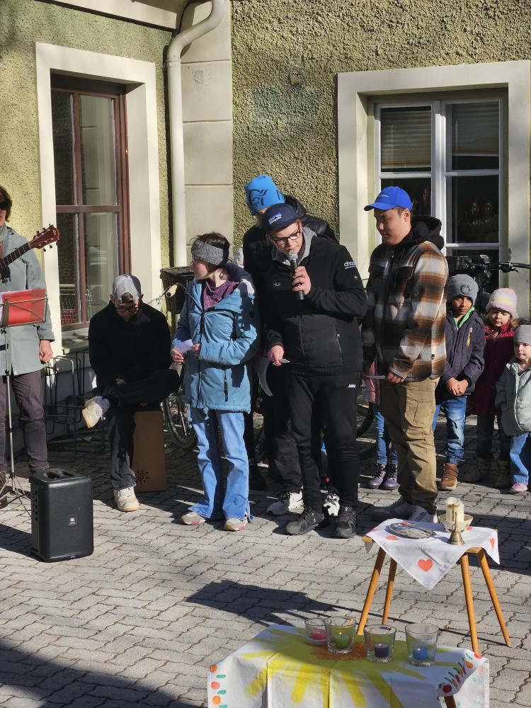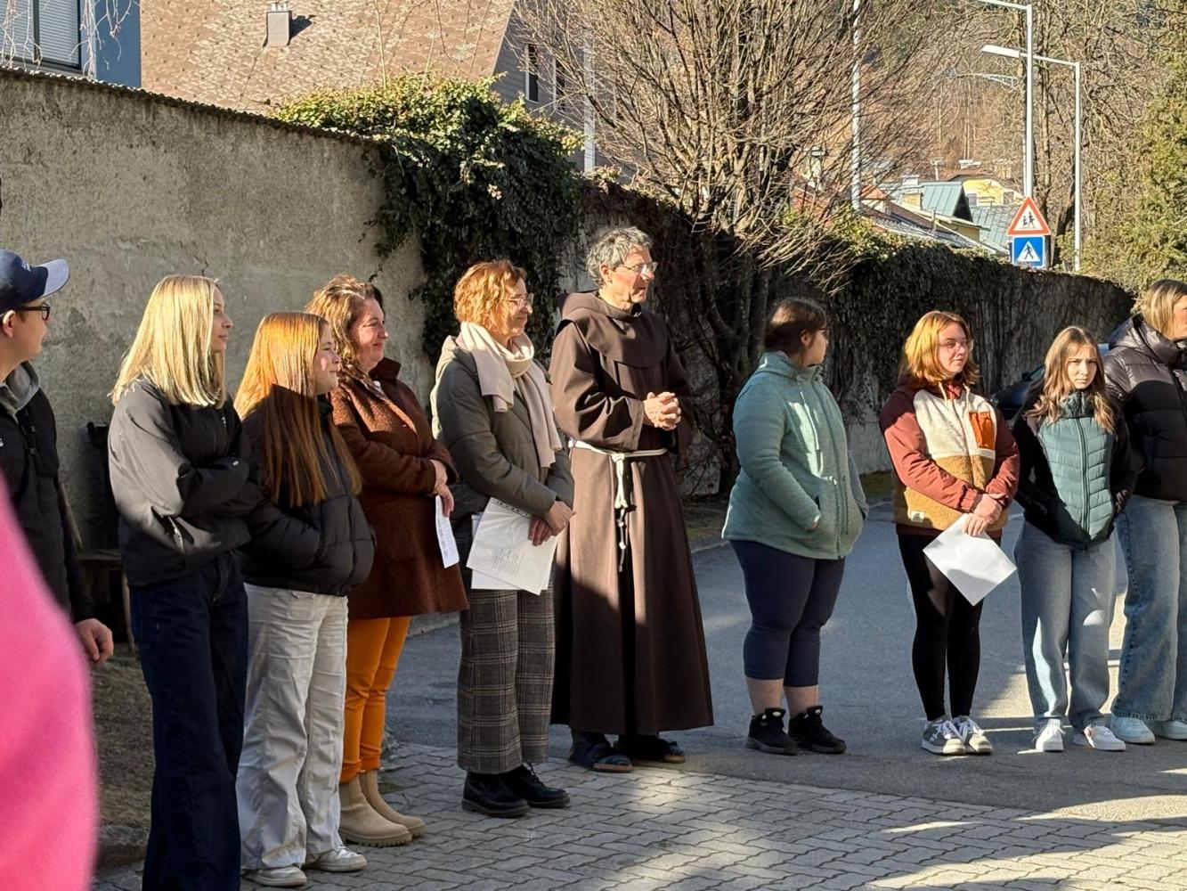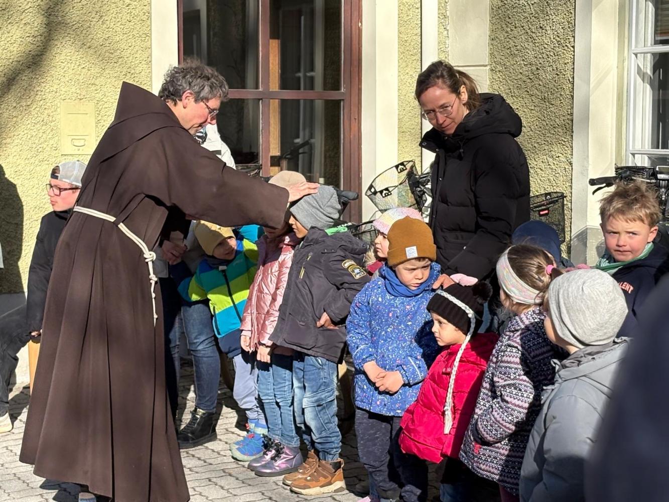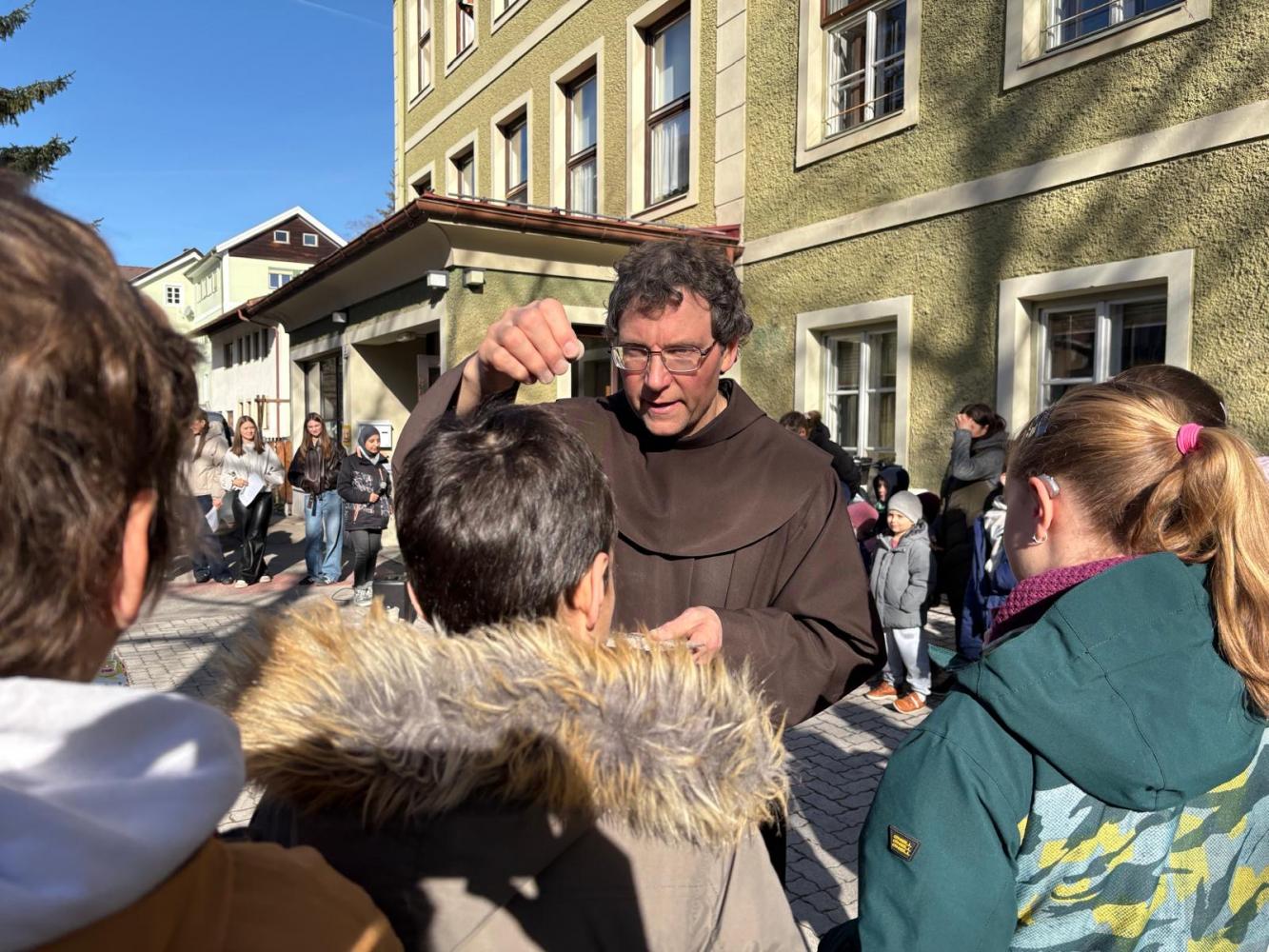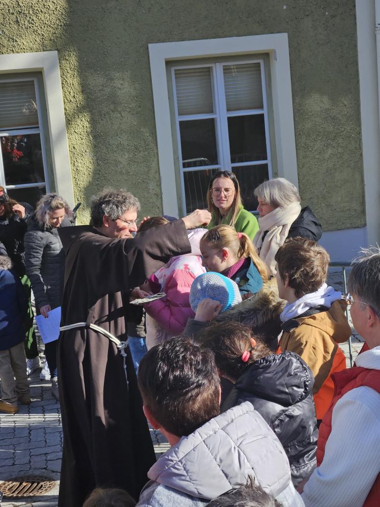 Den Beginn der Fastenzeit feiern wir traditionell mit einer Aschenauflegungs-Feier. Gemeinsam mit dem Kindergarten und Schüler:innen der FS der Dominikanerinnen trafen wir uns im Schulhof, wo Pater Martin die Asche aus den Palmkätzchen des Vorjahres segnete und uns damit ein Kreuzzeichen auf den Kopf streute.