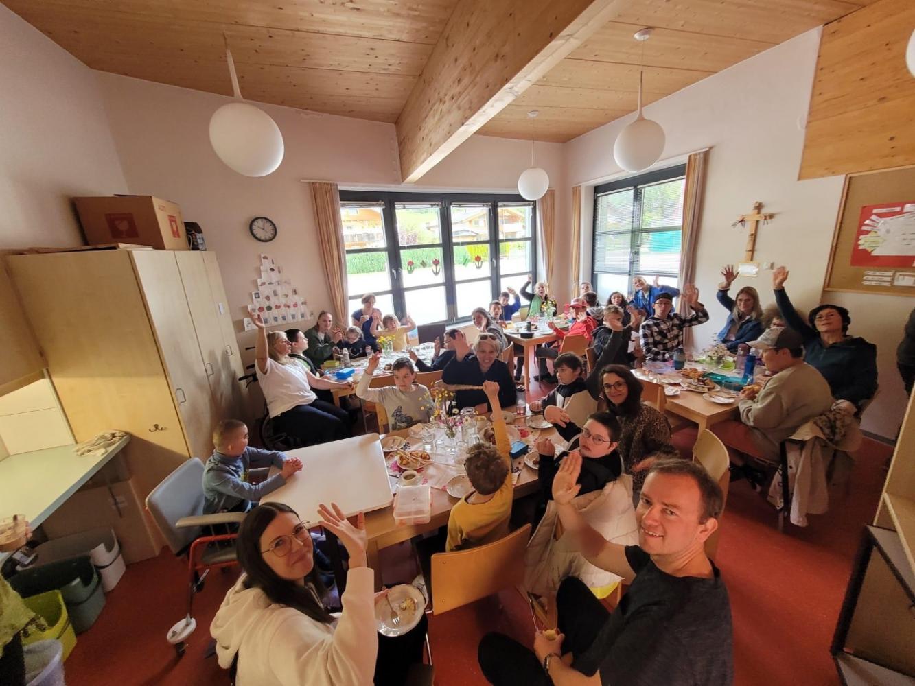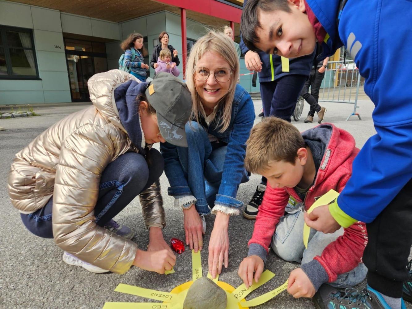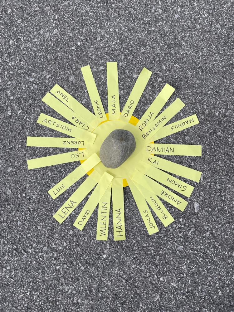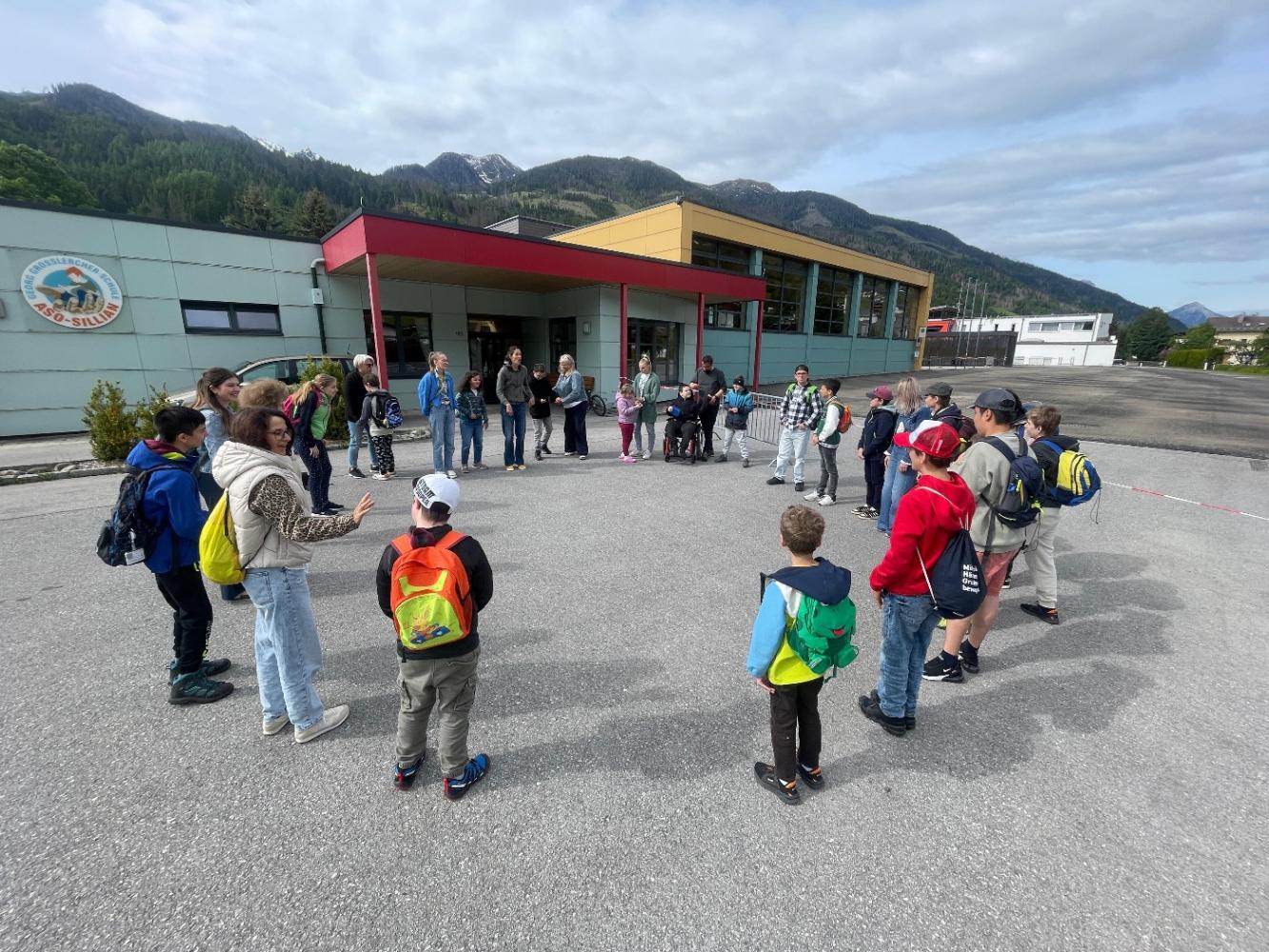 Bereits am Bahnhof wurden wir herzlich von einigen Kindern der ASO Sillian empfangen. Vor der Schule angekommen, erwartete uns die gesamte Schulgemeinschaft. Gemeinsam sangen und tanzten wir zur Einstimmung. Anschließend gestalteten wir zusammen eine große Sonne aus Papier, auf der unsere Namen als Zeichen der Zusammengehörigkeit verewigt wurden.