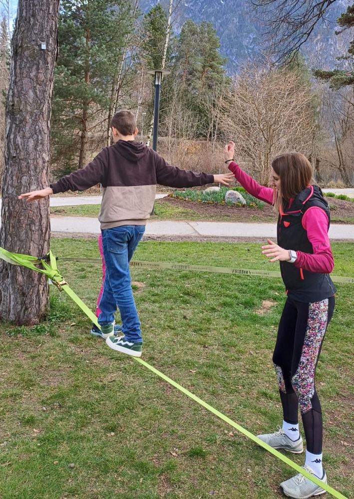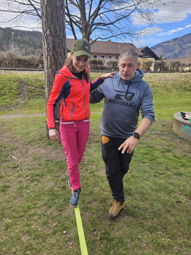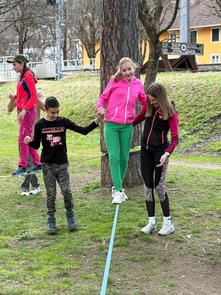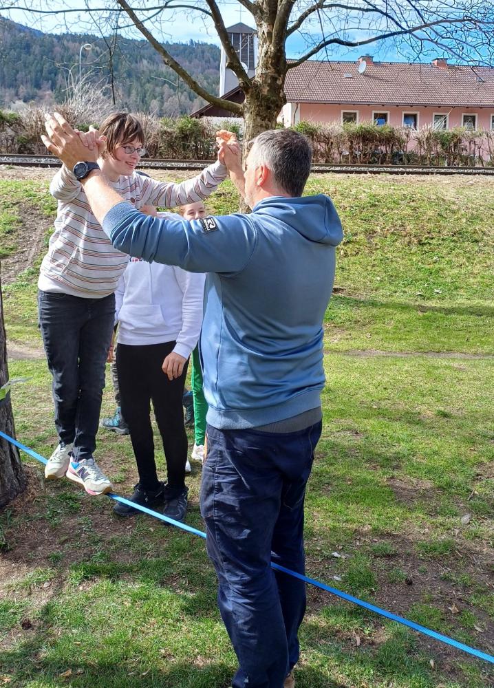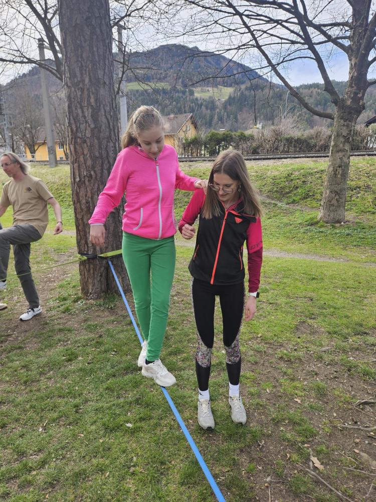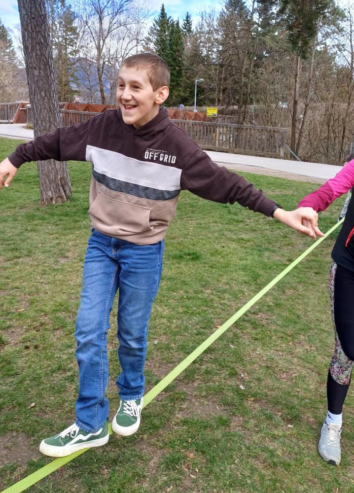 Die 3. und 4. Klasse haben mit Trainer Manuel Mascher einen Slackline-Nachmittag im Draupark vereinbart. Nachdem die meisten Schüler:innen damit schon positive Erfahrungen gemacht hatten, war die Vorfreude groß! Sie wissen nämlich ganz genau: Auf der Slackline wird die Rangordnung von Könnern und Nichtkönnern im Vergleich zum Schulbetrieb komplett umgedreht. Plötzlich sind die Erwachsenen diejenigen, die auf die Hilfe, Unterstützung und Tipps der Schüler:innen angewiesen sind!!! Dabei entwickelt sich ein wunderbares Lernfeld nicht nur für das Gleichgewicht, sondern auch für das soziale Lernen!