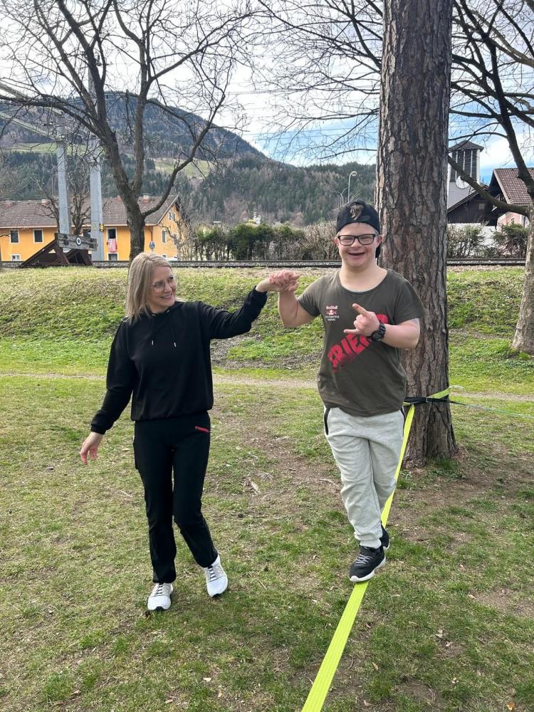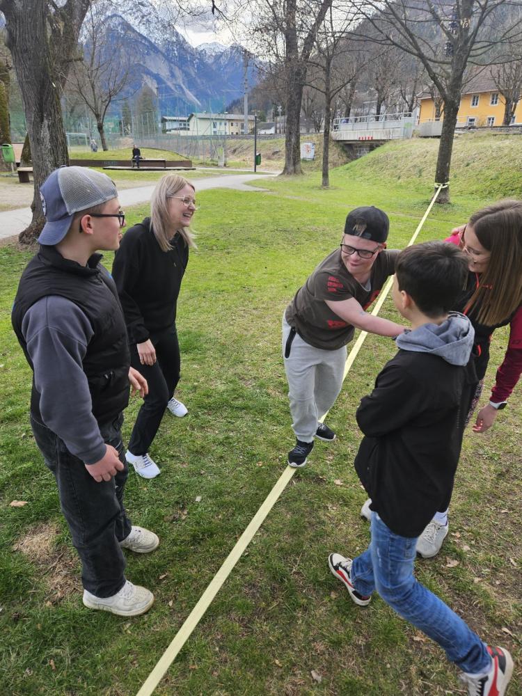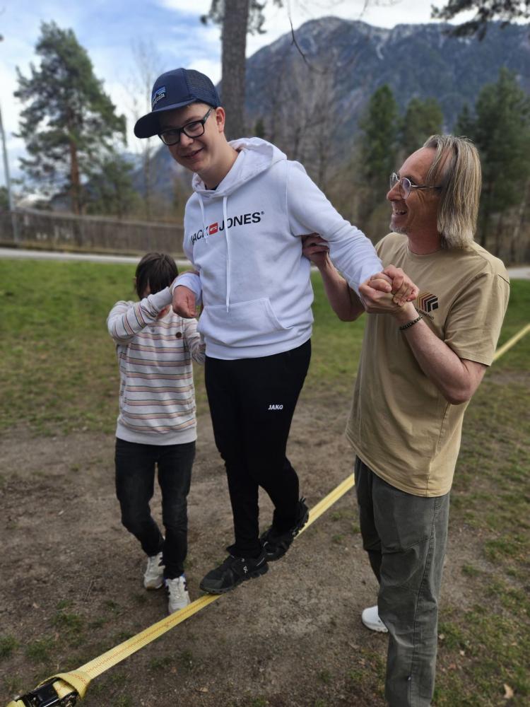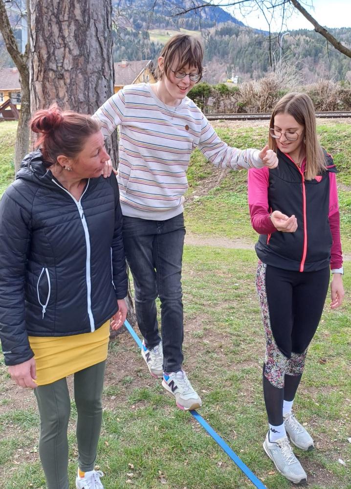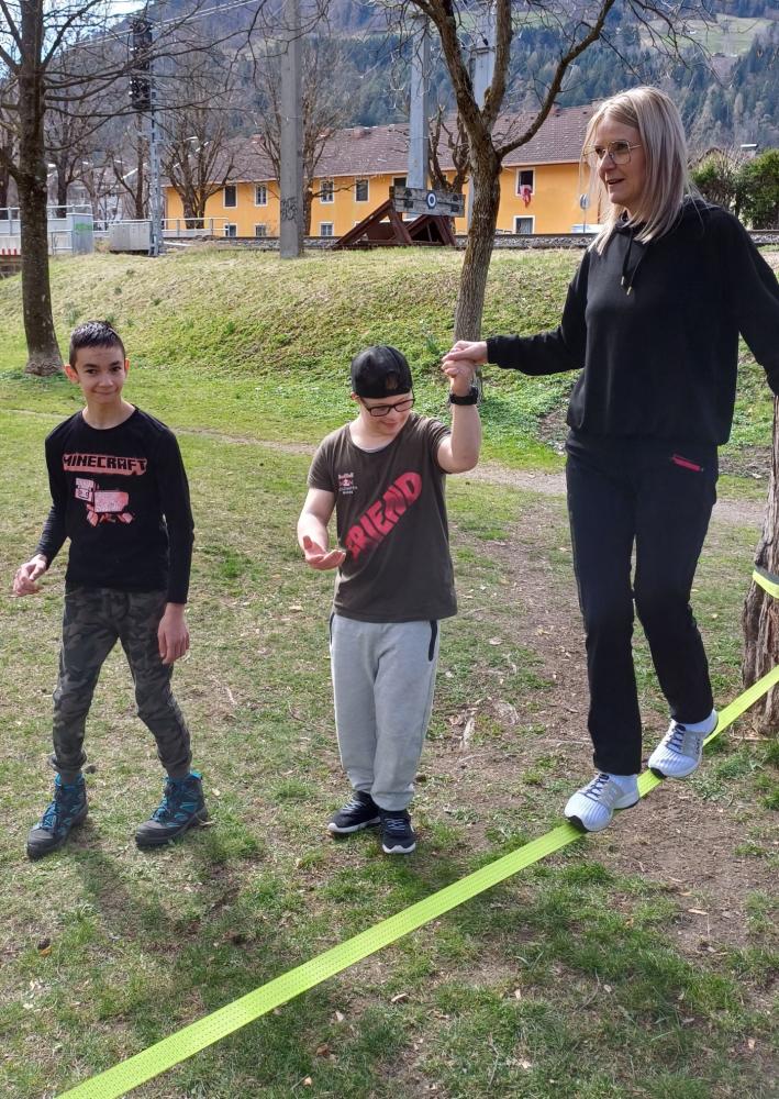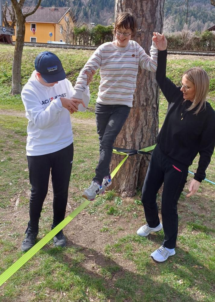 Die 3. und 4. Klasse haben mit Trainer Manuel Mascher einen Slackline-Nachmittag im Draupark vereinbart. Nachdem die meisten Schüler:innen damit schon positive Erfahrungen gemacht hatten, war die Vorfreude groß! Sie wissen nämlich ganz genau: Auf der Slackline wird die Rangordnung von Könnern und Nichtkönnern im Vergleich zum Schulbetrieb komplett umgedreht. Plötzlich sind die Erwachsenen diejenigen, die auf die Hilfe, Unterstützung und Tipps der Schüler:innen angewiesen sind!!! Dabei entwickelt sich ein wunderbares Lernfeld nicht nur für das Gleichgewicht, sondern auch für das soziale Lernen!