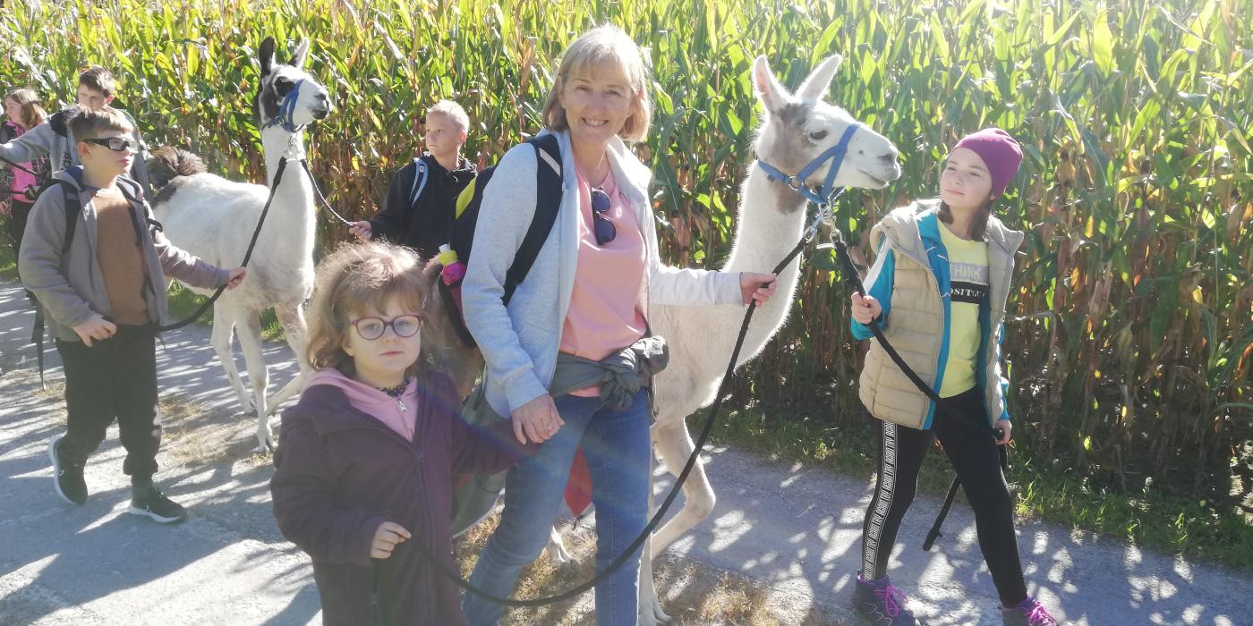 Unser gemeinsamer Schulausflug führte die Schüler:innen, Assistent:innen und Lehrer:innen auf unterschiedlichsten Wegen nach Lavant. Nicht wenige nutzten ihr bei der Fahrradprüfung erworbenes Wissen und radelten zum Treffpunkt beim Pegasus, die anderen fuhren gemütlich mit dem öffentlichen Verkehrsmittel die Dörferlinie ab, um dorthin zu gelangen. Beim Reitstall angekommen wurden alle nicht nur von den Pferden, sondern auch von einer Herde neugieriger Lamas erwartet. Nach einem ersten zaghaften gegenseitigen Kennenlernen, Streicheln und Kuscheln unternahmen die Schüler, eingeteilt in Kleingruppen, eine kurze Wanderung mit den Lamas an der Leine. Es war ein ganz besonderes Erlebnis, die Kommunikation der Tiere mit ihrem feinen Summen wahrzunehmen. Auch mussten die immer hungrigen Tiere öfters zum Weitergehen animiert werden. Nachdem alle Lamas wieder im Hänger verstaut waren, wartete in der Römerstube ein Mittagessen, bevor sich dann die einzelnen Klassen wieder auf den Rückweg zur Schule machten. Dieser Tag war auch auf Grund des traumhaften Wetters und des warmen Sonnenscheins ein tolles Erlebnis.
