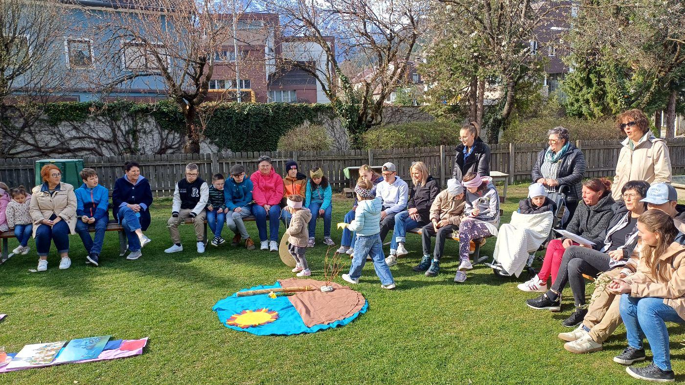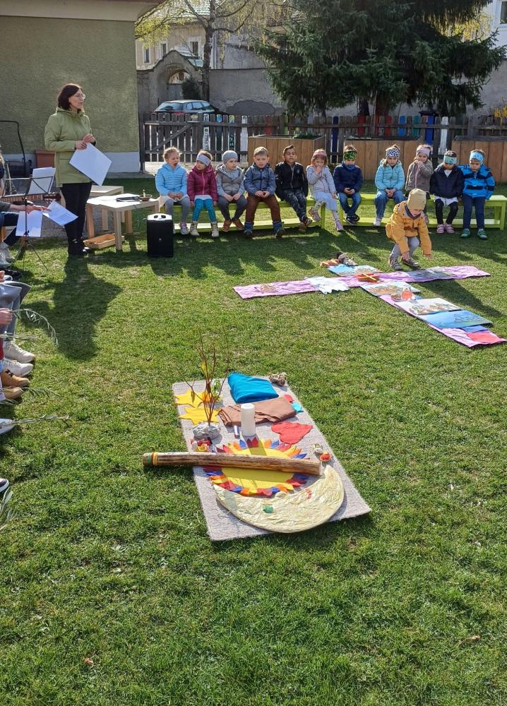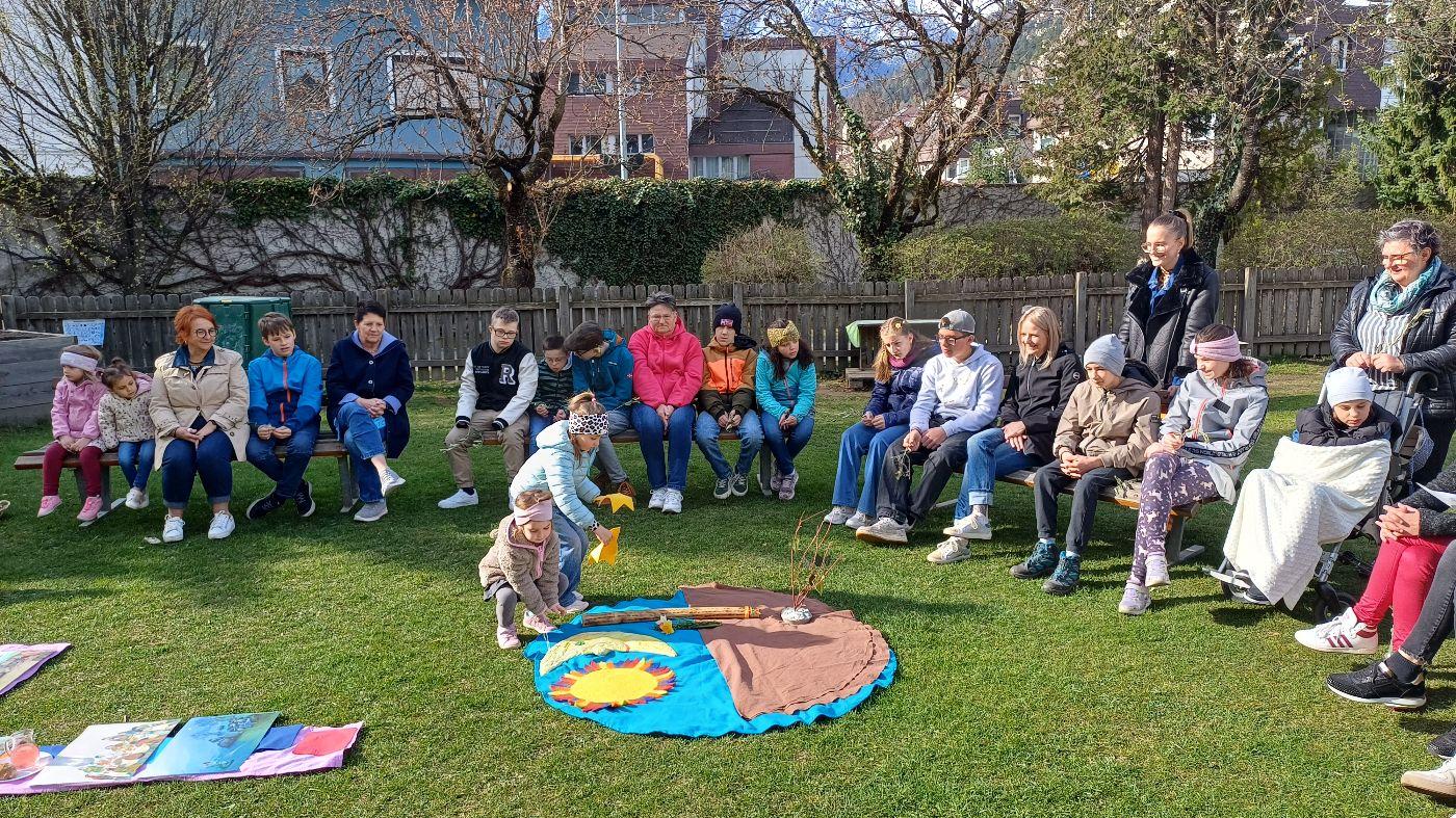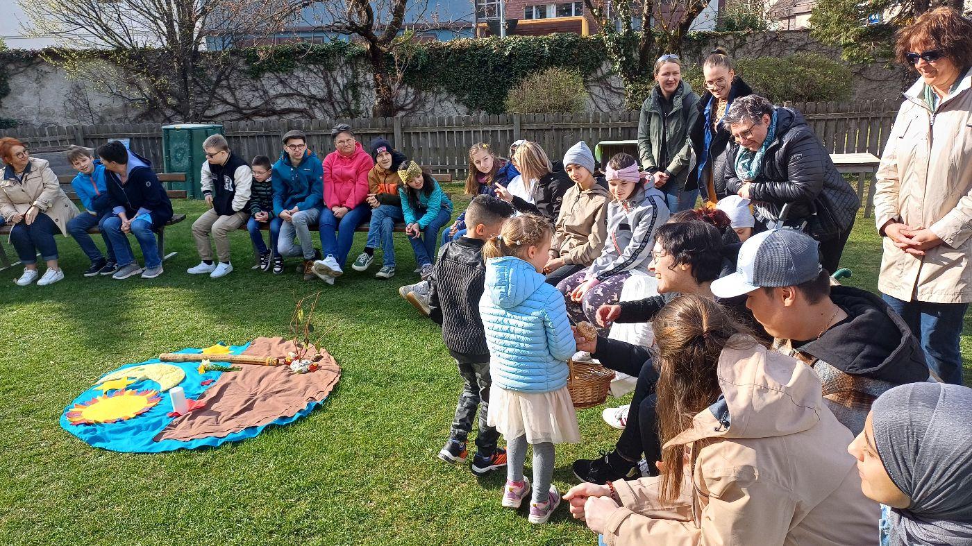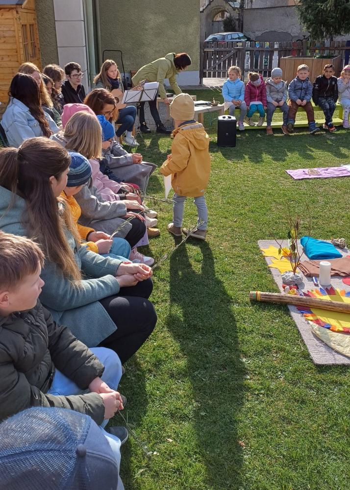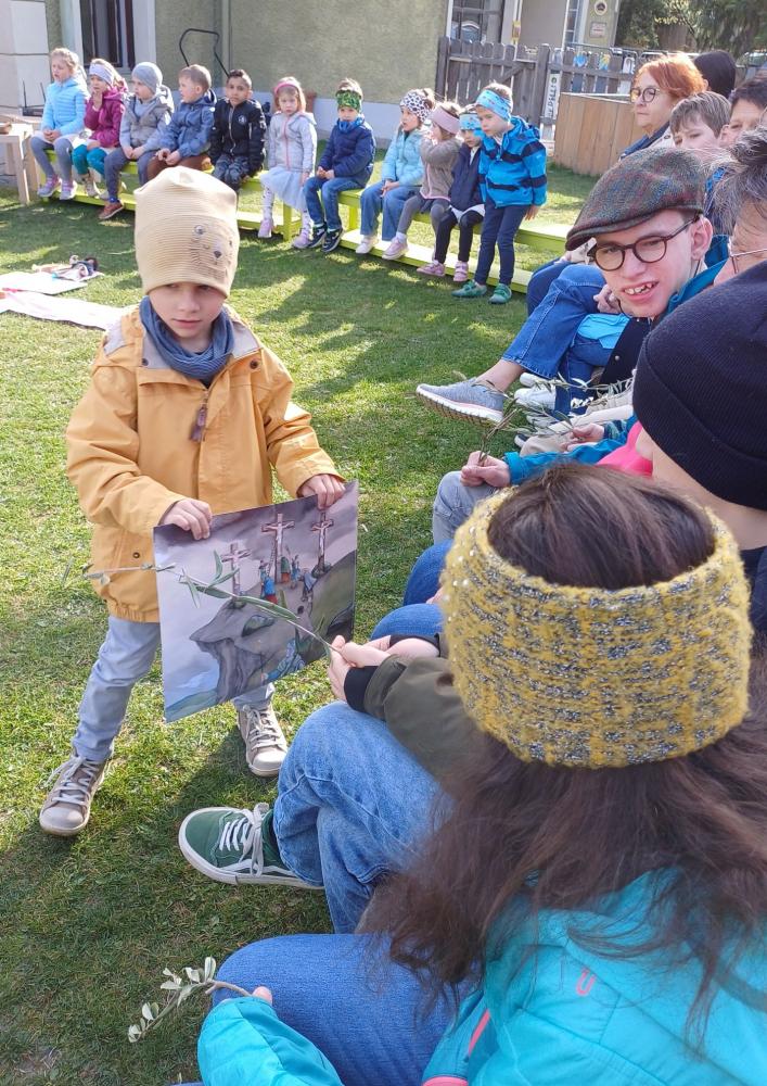 Heuer haben uns die Kinder vom Montessori-Kindergarten zu einem wunderbaren und berührenden Osterfest eingeladen! Sie haben die Leidensgeschichte und Auferstehung Jesu erzählt und bildlich dargestellt. Wir haben gemeinsam gesungen und sie haben uns das Wunder der Schöpfung in einem schönen Bodenbild bewusst gemacht.