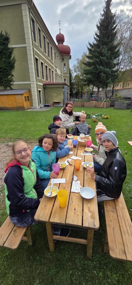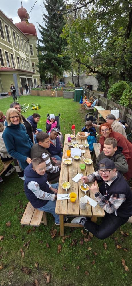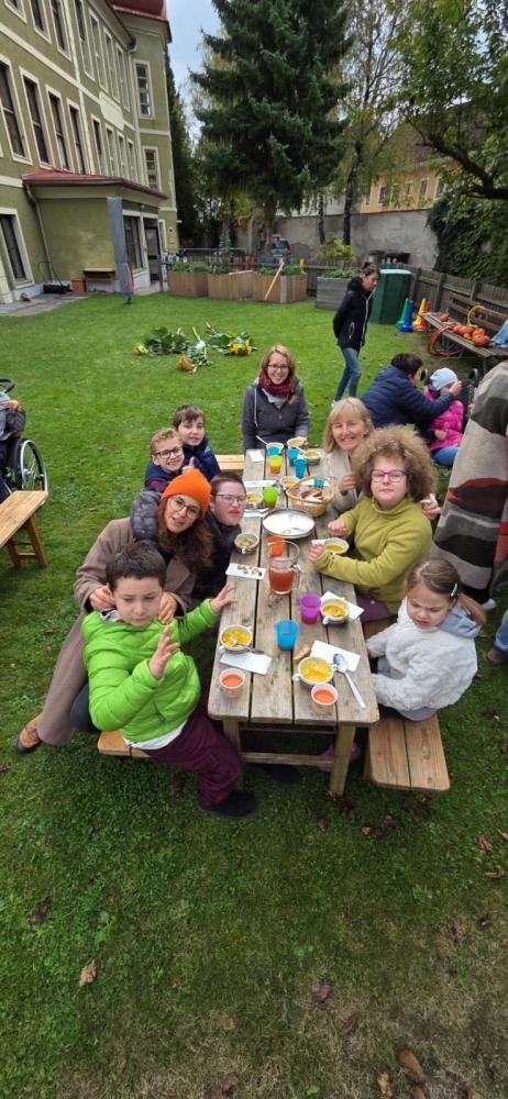 Zum Abschluss stärkten sich alle mit einer köstlichen Kürbissuppe, selbstgebackenem Brot und heißem Tee. Gemeinsam im Garten zu essen und das Kürbisfest gemütlich ausklingen zu lassen, machte das Fest wieder zu einem besonderen Erlebnis.