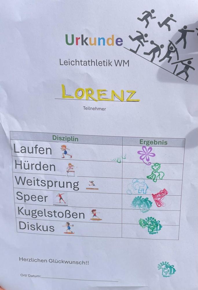 Zeitgleich zur Leichtathletik-Weltmeisterschaft in Tokio hat die 1. Klasse im September ihre eigene und ganz besondere WM ausgetragen. Mit großer Begeisterung und sportlichem Ehrgeiz traten die Schüler:innen in den Disziplinen Laufen, Hürden, Diskus, Speer, Weitsprung und Kugelstoßen an. Die jungen Athlet:innen zeigten beeindruckende Ausdauer und Motivation.